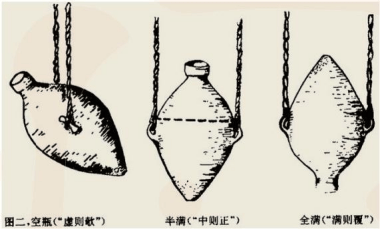 线:古代有 一 种“欹(qí) 器”,呈梭形,不克不及竖立,两头部门有两耳,以绳穿之,悬 于两杆之间。当里面空着的时候,因沉力感化,器皿是斜的;水至六分,竖曲而立;水逾七分,则 发生倾覆。正所谓“虚则欹,中则正,满则覆”。谈谈你的理解。