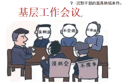 漫画描述的是下层会议场景,图中有6位下层干部正在开会,此中有5位干部戴着面具,面具上分 别写着“拆糊涂”“不会说”“不敢说”“没机遇”和“不揽事”。漫画内容所反映的是当下部门基 层干部群体失语的现象,这让我感应十分管忧。呈现这种现象的缘由,我认为有以下几点缘由。